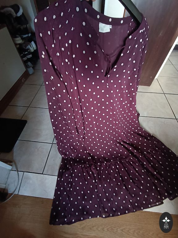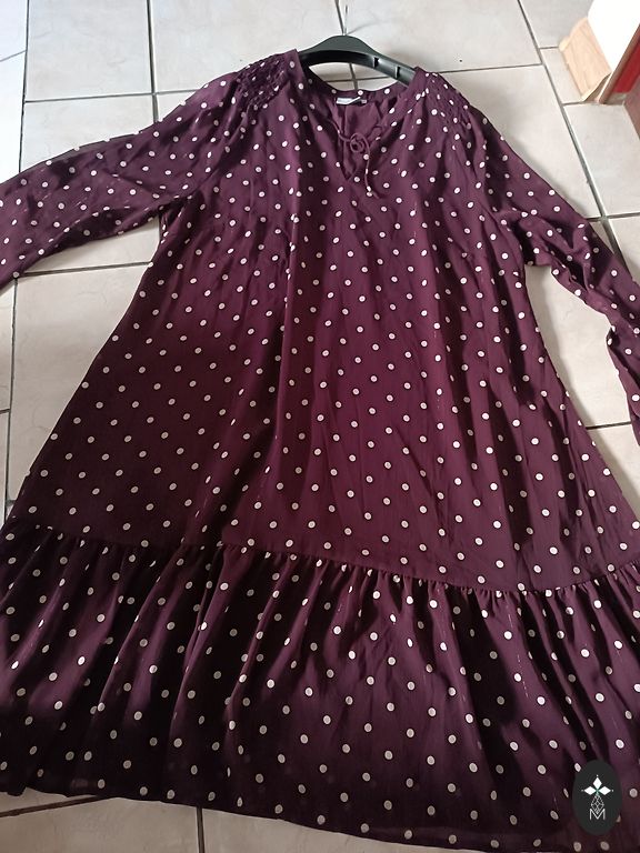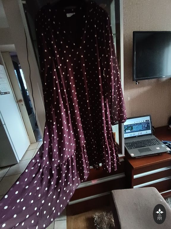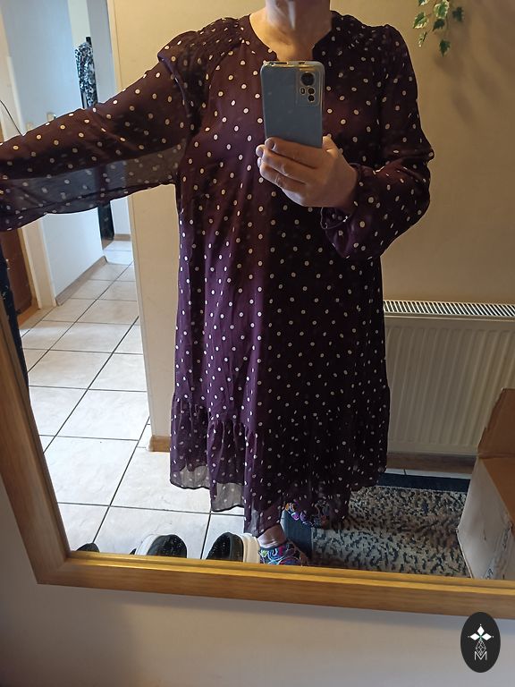 Storas, tankus suknelė su nelygiu paviršiumi. Krūtinė 100–104, talėja 88–92, klubai 102–108, ilgis 96 cm. 3/4 rankovės yra 56 cm.