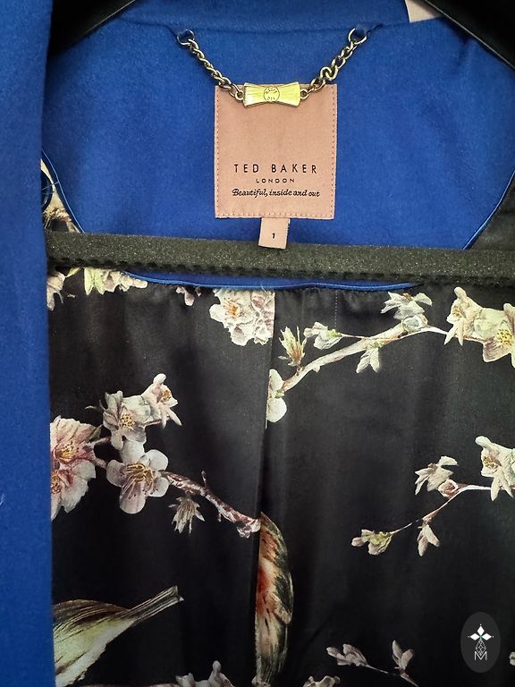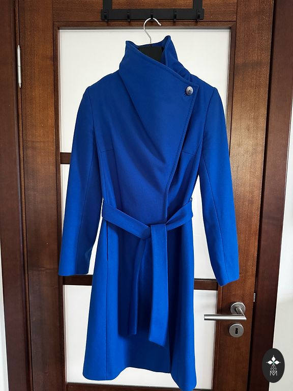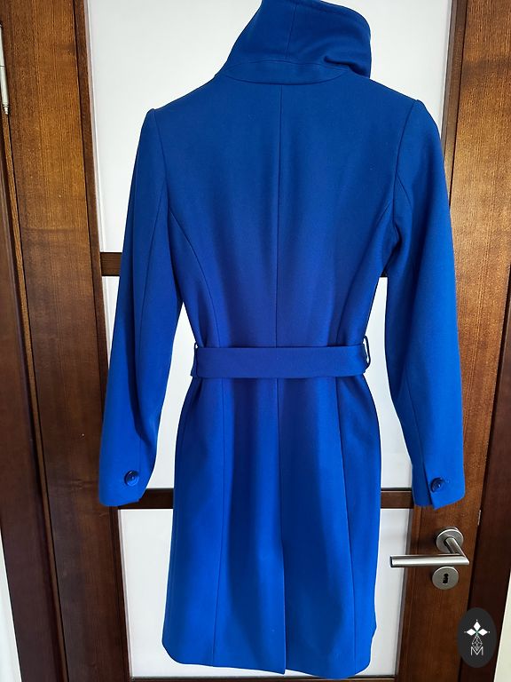 Jauns, tumši zils vilnas mētelis.