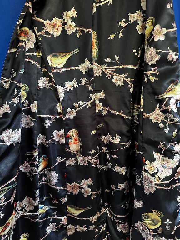 Krūšu apkārtmērs: 94 cm, vidukļa apkārtmērs: 92 cm, garums no pleca: 86 cm, piedurkņu garums no pleca: 59 cm. Sastāvs: 55 % vilna, 35 % poliesters, 4 % akrils, 6 % citi materiāli.