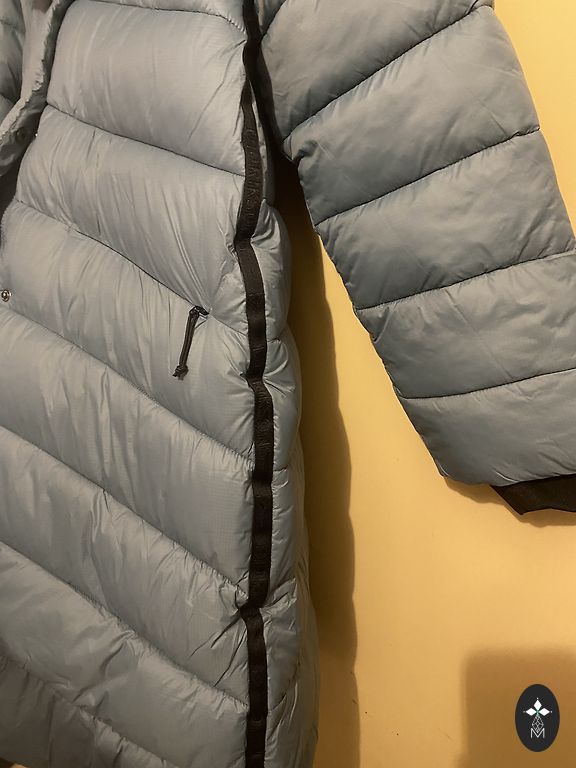 Prigludusi striukė su lengvu paminkštinimu ir raišteliu ties juosmeniu bei metalinėmis sagomis. Išorinis audinys iš poliesterio ir medvilnės mišinio. Medžiaga