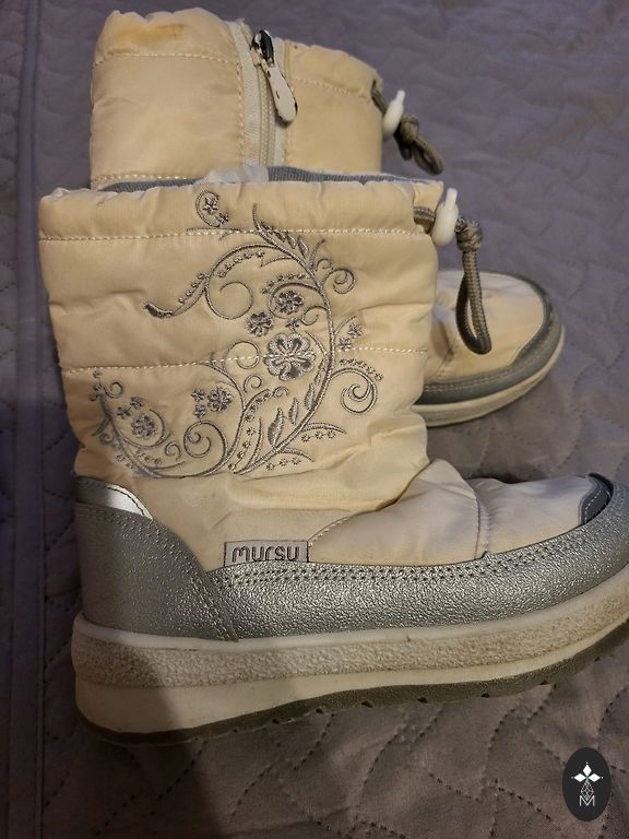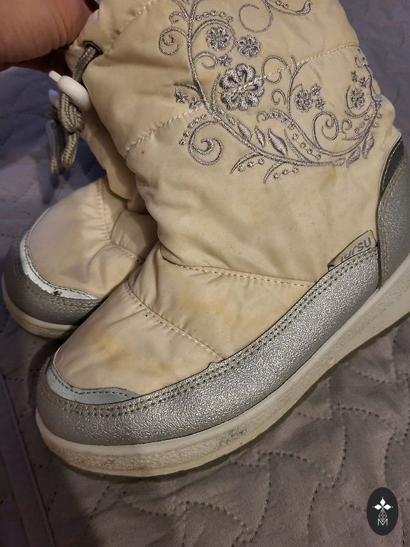 Зимние ботинки для девочки. Теплые, водонепроницаемые. После одного ребенка. На носках есть потертости, но это только визуальный дефект и не влияет на другие свойства.