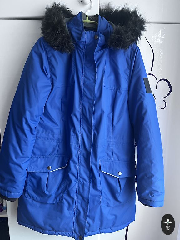 Hooaja keskel kantav pikk denim-mantel (lambanahast voodriga), kinnitub haakidega. Pikkus – 106 cm, rinnamõõt – 106 cm. Sobib suurusele M.
