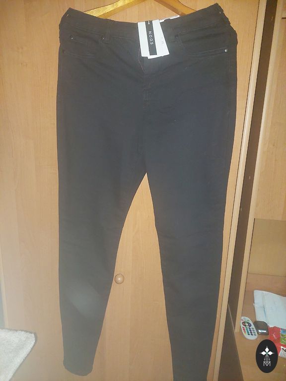 Elastīga materiāla Džinsi melnā krāsā ar nodiluma efektu, sašaurināti, ar pērlīšu apdari kājas lejasdaļā. Viduklis 80, gurni 90, kopējais garums 100, iekšējās vīles garums 70.