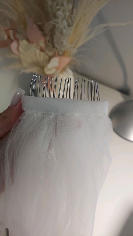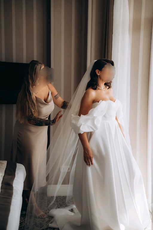 A beautiful dress that made my special day even more beautiful. The charm and uniqueness of the dress lie in the massive yet airy, romantic-looking straps. The dress has large pockets and a slit on the side, which I specifically asked the seamstress to create for the photoshoot, as the slit is not visible when walking. The dress will suit tall individuals. I am 175 cm tall with 9 cm heels, and it fit very well. The waist, where the corset cannot yet be adjusted, is 80 cm. The bust circumference is 94 cm, but the corset can be adjusted to be smaller or larger. The dress has been dry cleaned, but the cleaning was of poor quality, leaving some spots on the lower part of the dress, which can only be noticed if you look carefully. If you know a good dry cleaner, you can take it there, and I believe it will be cleaned.