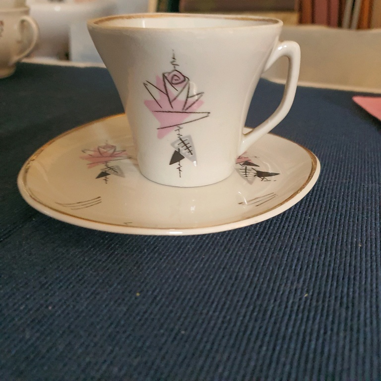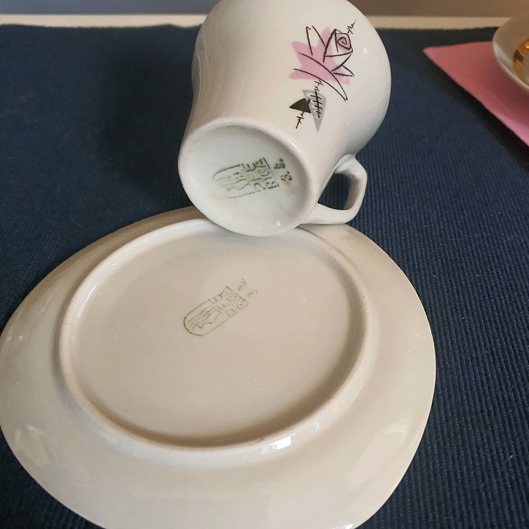 Kohvikann, suhkrutoos, piima- ja koorekann, 6 tassi alustega ja 6 taldrikut.