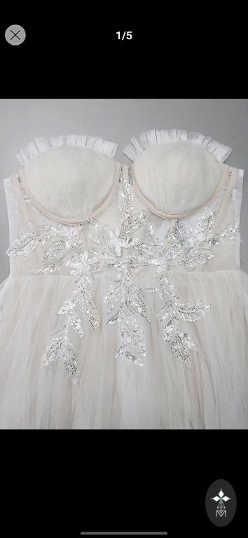 Pildil on pikkus 1,67 m, seljal suur väljalõige ja ees madal dekoltee. Allosas pole polstrit ega luid, kuid paks kangas tekstuurse koega loob mahukuse. Ostetud, kuid kodust väljaspool kunagi kandmata, kuna osteti teine ese.