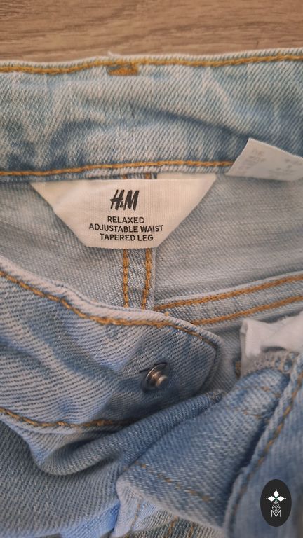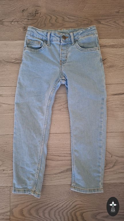 Pāris reizes uzvilkta džinsu jaka ar kapuci. Kapuce noņemama. Norādīts 116.izm.,bet ir uz mazo pusi.