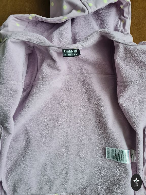 The size is marked as 104, but we tried it on a 110 and even a 116. So it will fit for a long time. The fasteners work well, there are a few minor details that are worn out - for example, the ribbon on the zipper, but there are no other defects or damage.