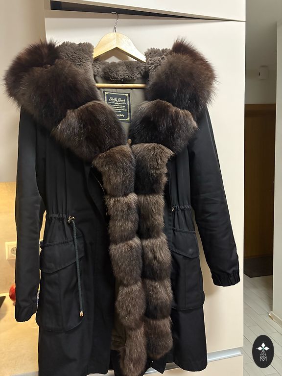 Легкая и очень комфортная всесезонные парка на лебяжьем пуху с капюшоном. Капюшон оторочен натуральным мехом. Размер M/L. Длина по спинке 90см.