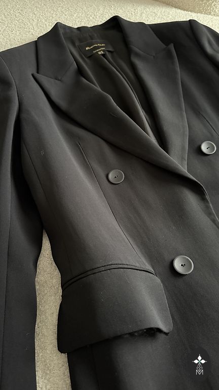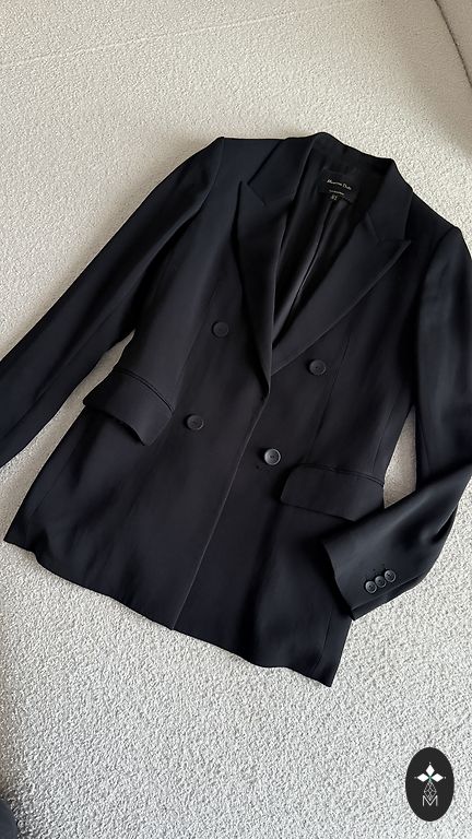 An elegant jacket that will look good with both classic and casual attire. Black and white with red details. Nice sleeves with buttons. The edges of the jacket are finished with fringes for a more chic look.