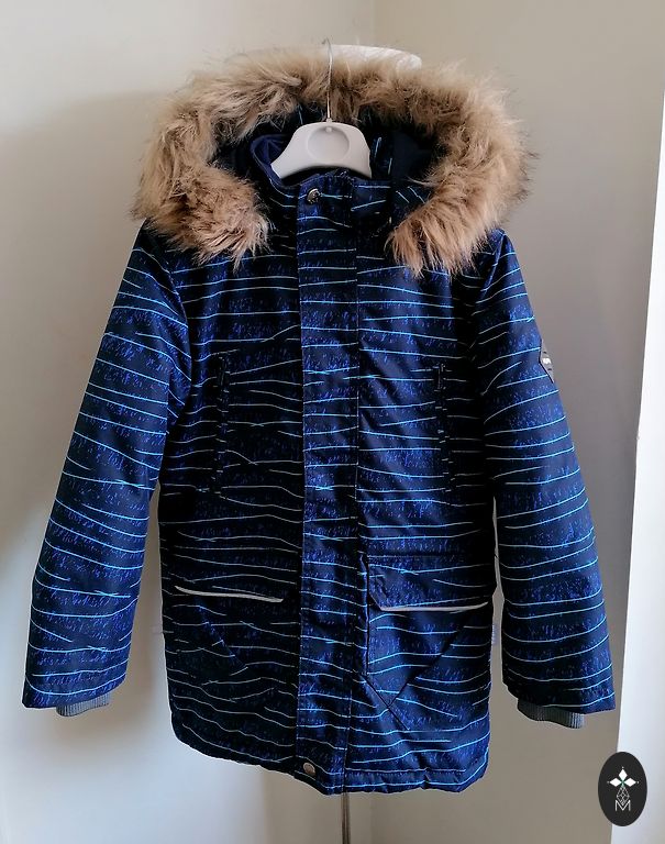 Šilta striukė su gobtuvu ir su gofruotais atvartais. Viduje fliso pamušalas. Atspari vandeniui.