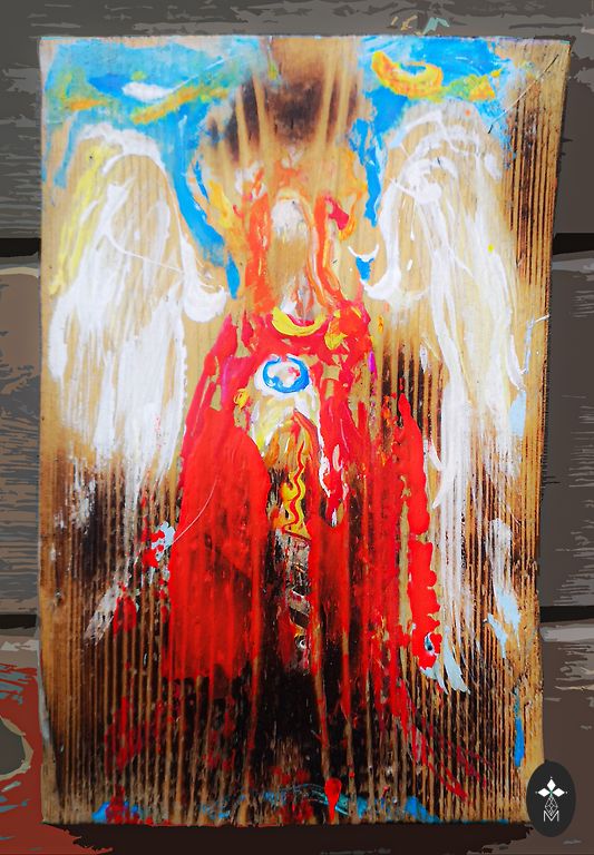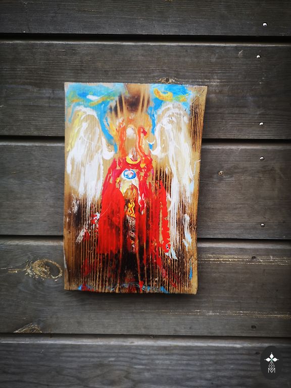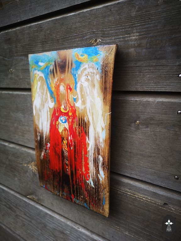 Painting on a wooden board from the Tarot card series. XIX card - The Sun. 86x22x2 cm