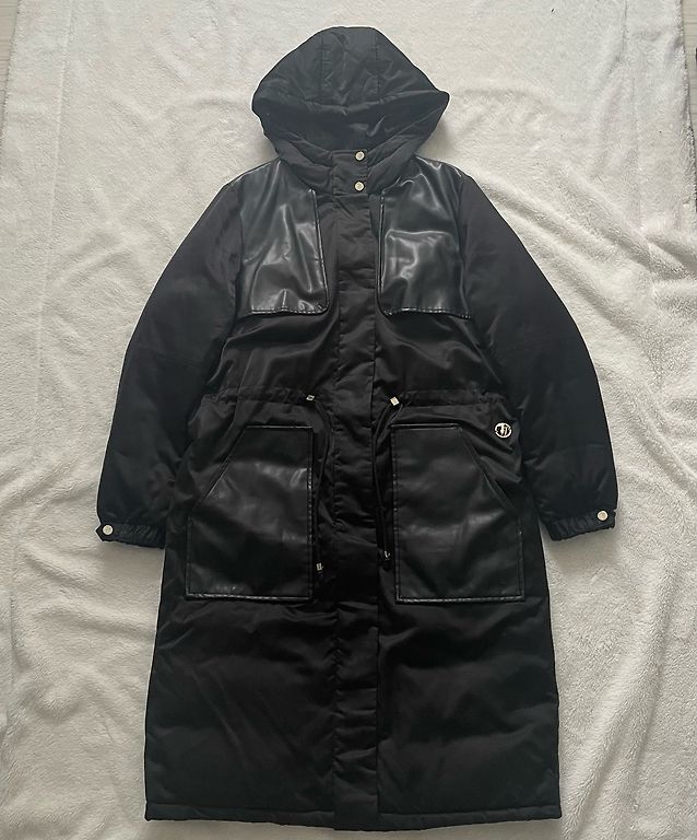 Must mantel suurte kapuutsiga.
