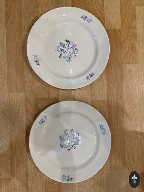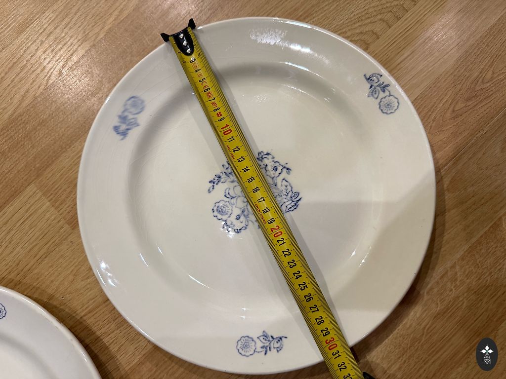 Parastais šķīvis 11 gabali un padziļinātais šķīvis/ bļoda - 11 gabali. Izgatavoti no porcelāna. Laba stāvoklī. Atsevišķiem šķīvjiem nelieli defekti pārklājumā. Zelta maliņas nav nodilušas. Šie trauki nav izmantoti ikdienā, izmantoti svētkos pēdējos 15 gadus nav lietoti vispār.