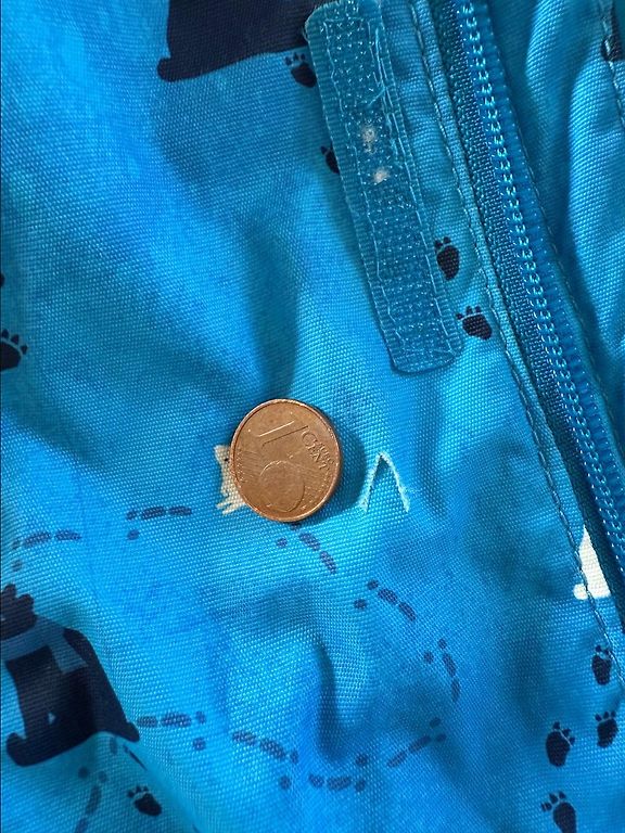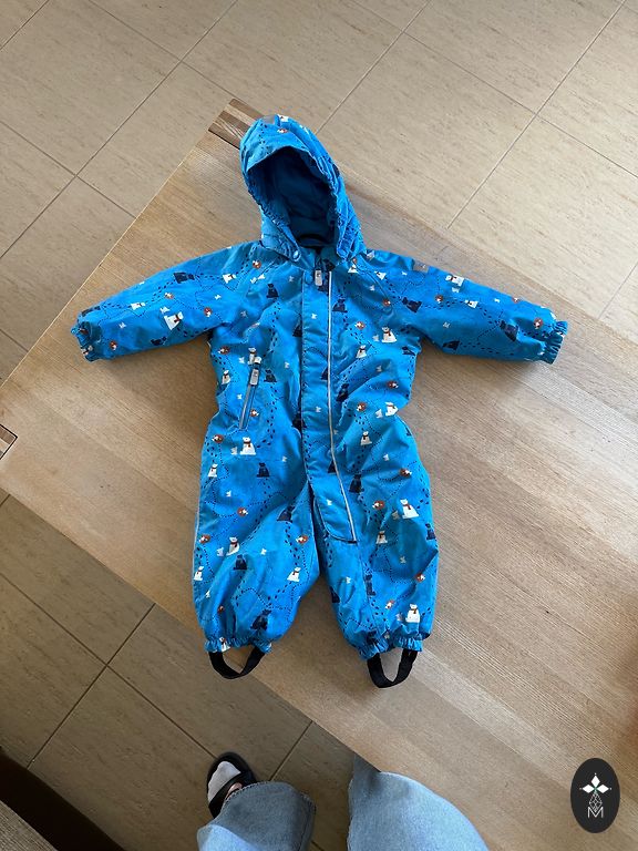Defektai: iš dalies nusidėvėję atšvaitai ir maži taškeliai kombinezono viduje (matomi nuotraukose). Nėra kojų gumos. Naudojimui nė vienas iš defektų netrukdo, visa kita puikios būklės.