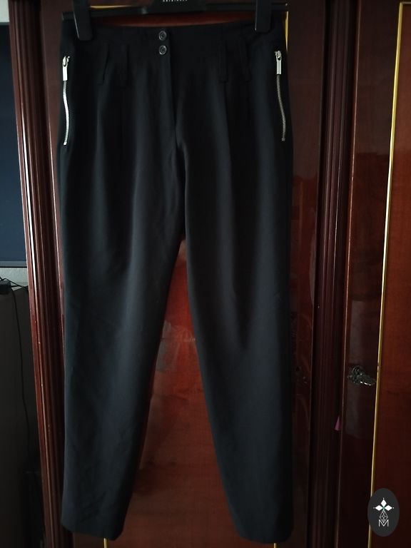 Švarkelio spalvos yra violetiniai atspalviai. Ryškesni gyvenime. Nėra mėlynos kontrasto blizgančiame viršuje. Tamsiai violetinė. Abi pusės labai gerai priglunda. Blizganti apačia taip pat tempiasi. Apačioje pritvirtintas viršus viršuje kaip švarkas. Nepritempiant krūtinė 76 cm. Priglunda dar. Parašyta 60 dydis. Kelnės lengvos, gumos priglunda. Nepritempiant 58 cm lengvai priglunda iki 70 cm, ilgis 106,5 cm, vidurys surišamas.