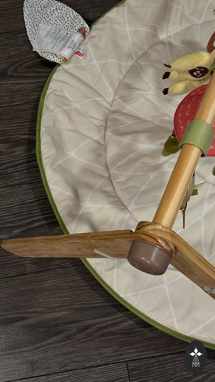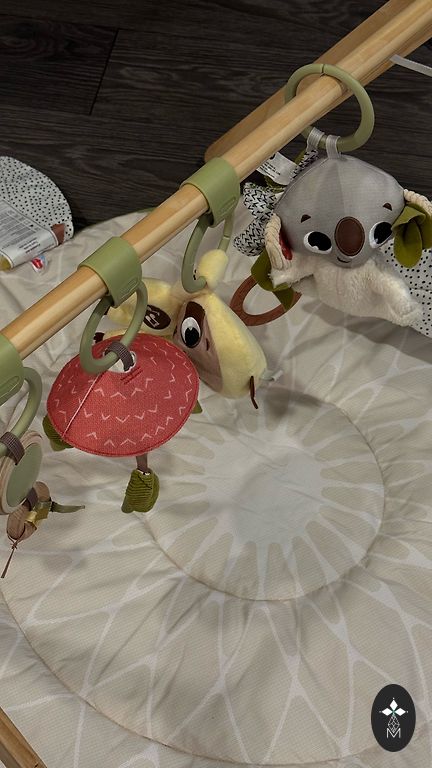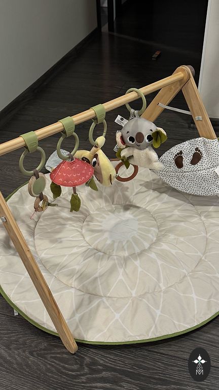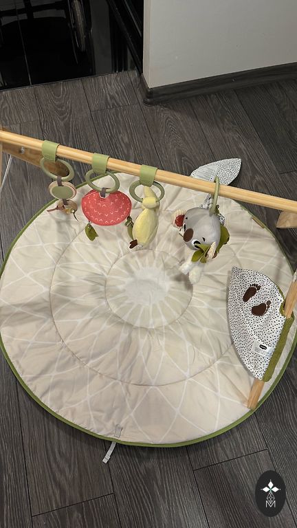 Attīstošs paklājiņš Tiny Love Move & Play, 110x110cm, ar regulējamu muzikālo pavadījumu, gaismiņām, dažādiem mīkstiem, čaukstošiem materiāliem un mantiņām. Mīkstās jāmazgā ar rokām, gumijas var likt veļas mašīnā. Paklāju arī var veļas mašīnā mazgāt. Pieejams ar mantiņām, kas redamas bildē. No sākotnējā komplekta spogulis un viens grabulis ir pazuduši. Bet ir iespēja piestiprināt arī citus grabuļus.