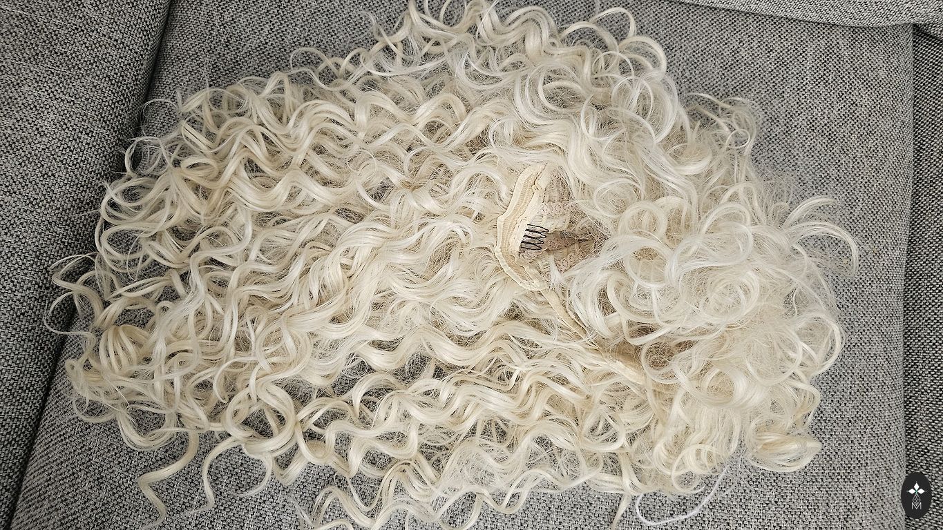 Парик из натуральных волос, который можно мыть, стричь, укладывать, выпрямлять. Не использовался, даже кружево не обрезано - не понадобилось, но я купила все необходимое, как бархатные ленты, так и силиконовая лента с шипами, капроновая шапочка, клейкие листочки, жидкий клей и шампунь для удаления клея.