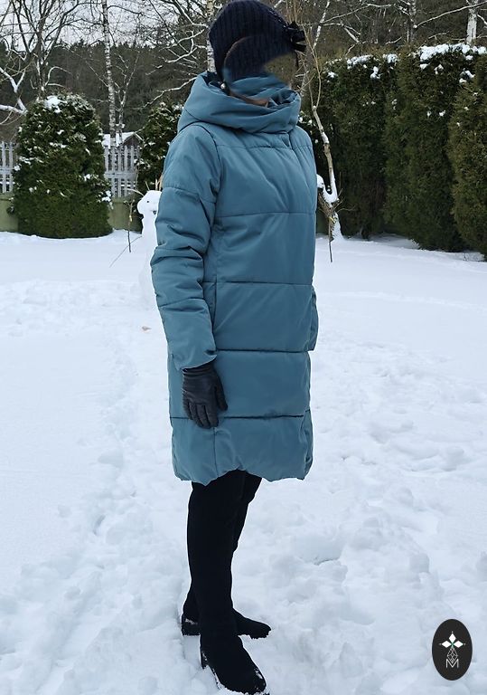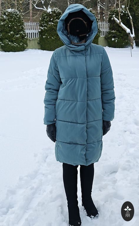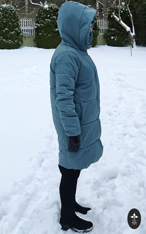 Silta jaka, apkaklē pielocīta kapuce. Garums 60 cm, piekurkne 65 cm, platums pie padusēm 46 cm.