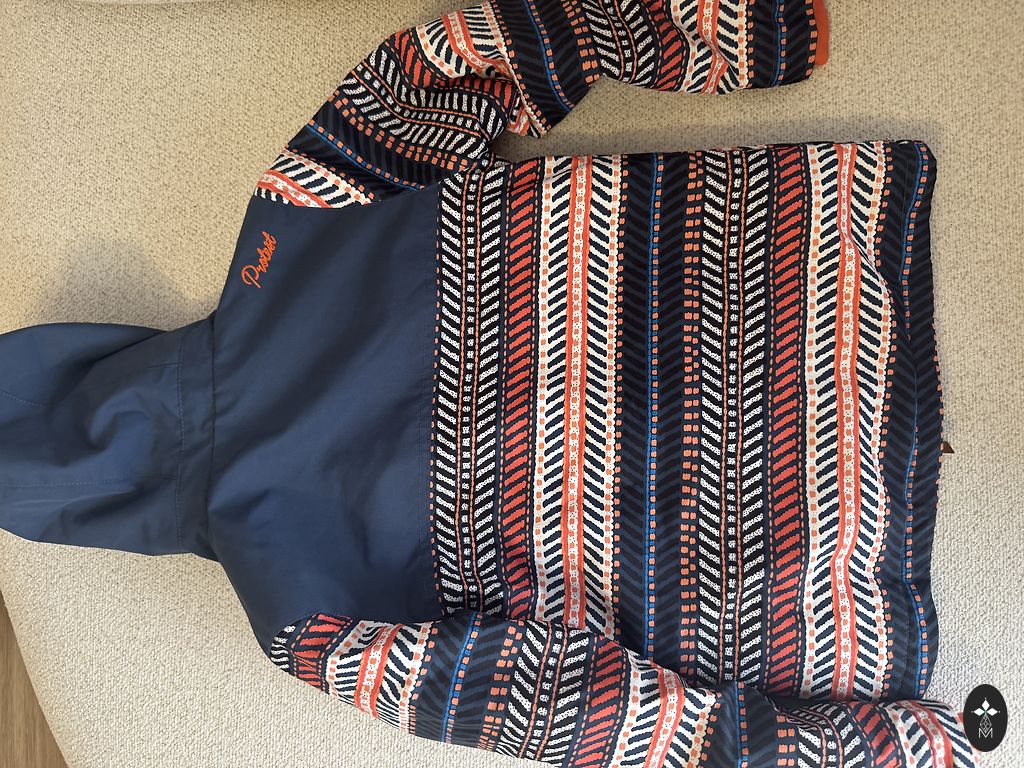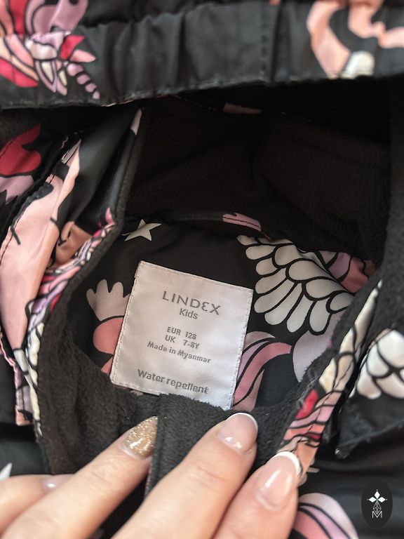 Light but warm outer jacket, fits sizes 122-128, large comfortable pockets. The jacket is in good condition, the only flaw is that the color has worn off the button on the sleeve.