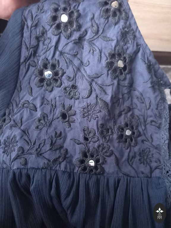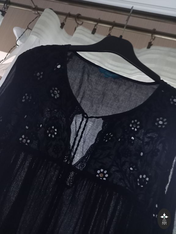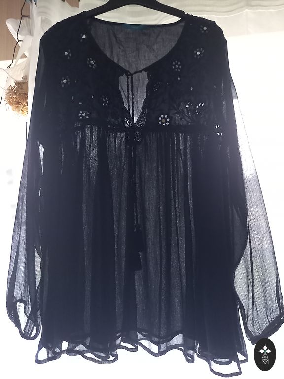 Elastic waistband with ties. Front wrap style. Bust 70 cm, length 74 cm, from top to middle 49 cm, bottom hem 25 cm.