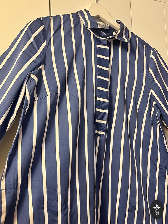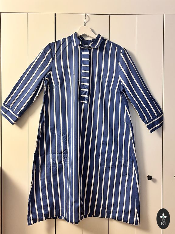 Хлопок с эластаном, фирма NUMPH. длина 110 см. под мышками 50-52 см. на бедрах пышная, до 63 см. полная цена 115 евро, куплено со скидкой. ярко-темно-синий с белым.