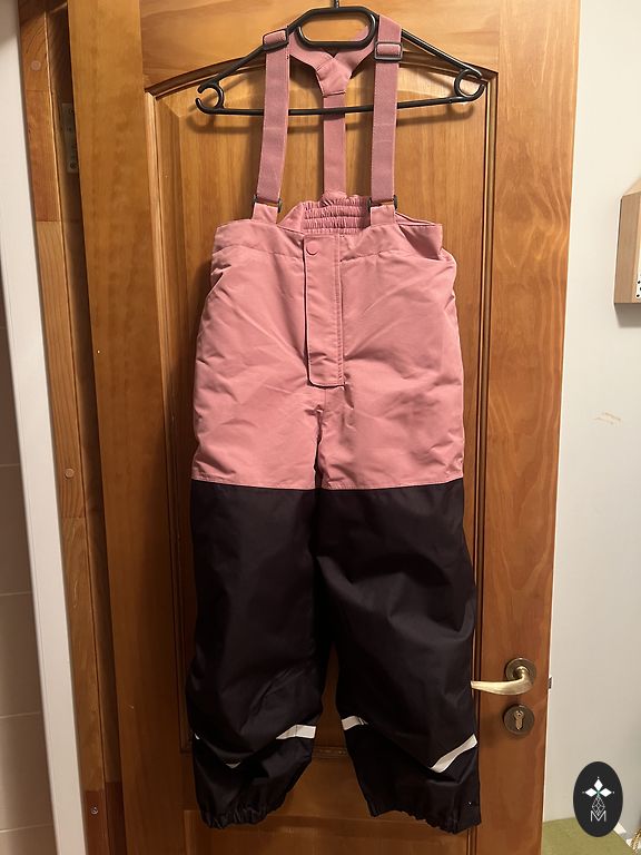 Puikios lietaus kelnės, nes dalys, kurios labiau susitepa, yra juodos, o kitur švelniai rožinės. Reguliuojamas diržas, tinka ilgiau nei 116 cm ilgis.