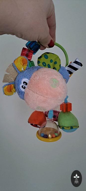 Išplauta ir paruošta keliauti pas naują savininką. Kojelės ir ausytės šlama. Spalvingas ir įdomus žaislas, kurį galima pakabinti ant automobilio kėdutės ar vežimėlio. Įvairios medžiagos ir įvairūs barškučiai lavina vaiko klausą, regėjimą ir koordinaciją.