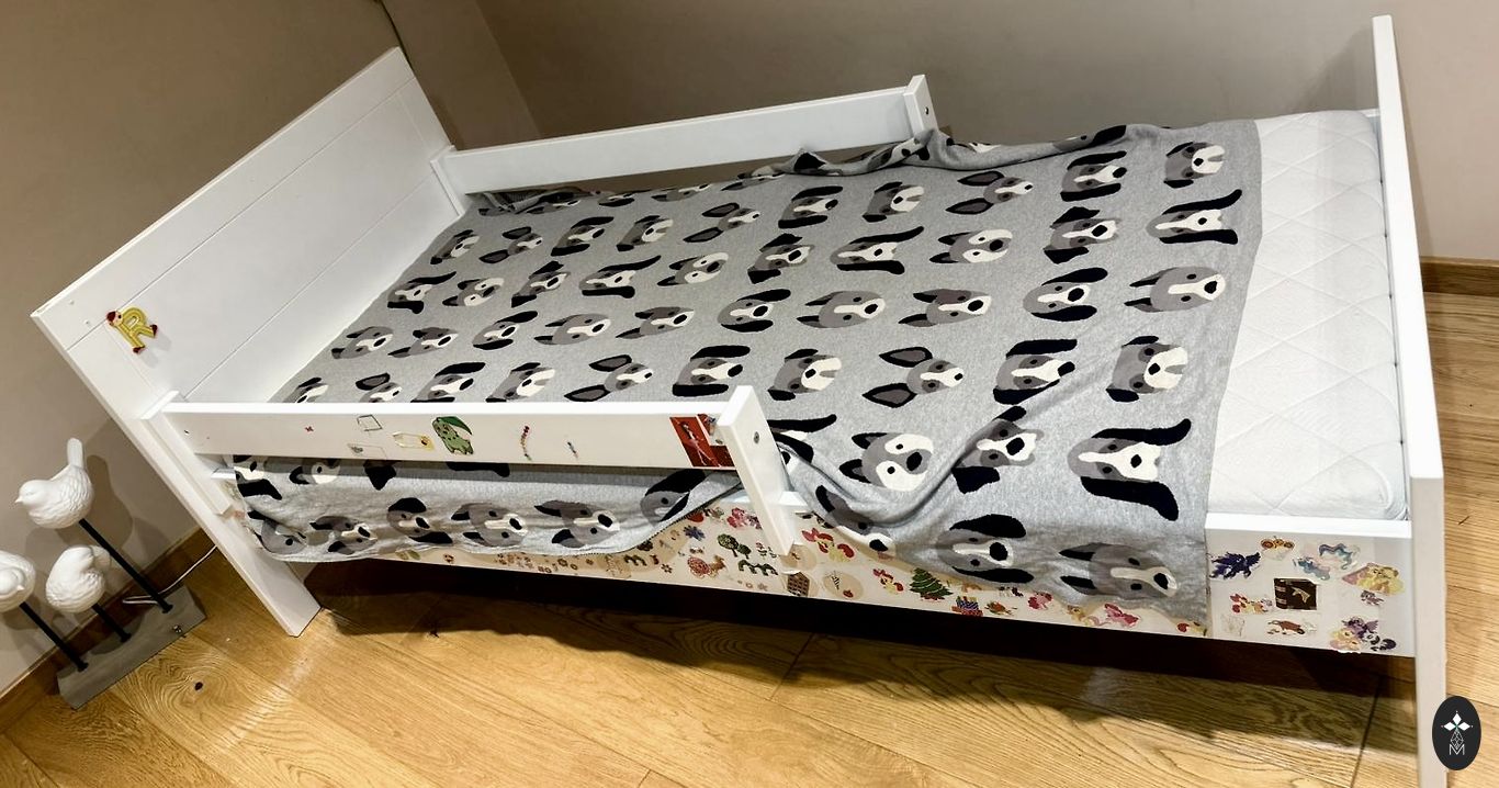 Gultiņa trīs līmeņu augstuma pozīcijām, noņemamu malu un izņemamām redelēm. Apakša no ozolkoka, līdzi matracis, baldahīns ar turētāju un drēbju kabatas visādiem nieciņiem. Paladziņu vairākus.Tagad esam izauguši. Mala nedaudz apskādēta, kad zobi auga, bet nav traki sabojāta. Cena runājama