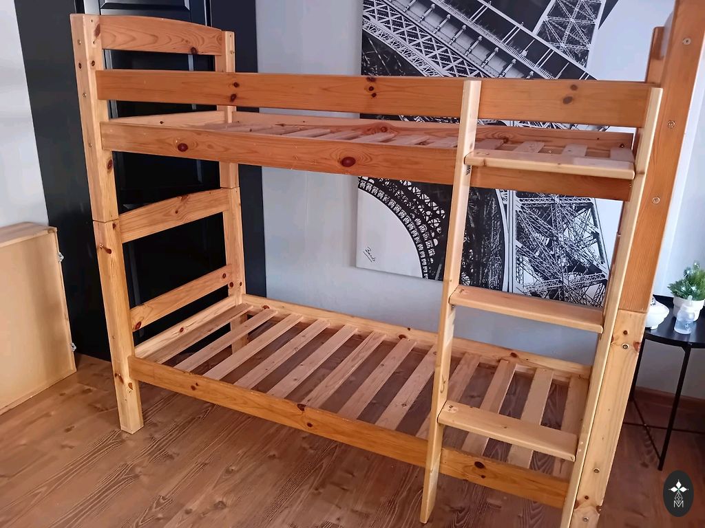 Lova - namelis su čiužiniu. Geros būklės, tik kelių kačių nagų įbrėžimai. Matmenys - ilgis 150 cm, plotis 80 cm, aukštis 170 cm.