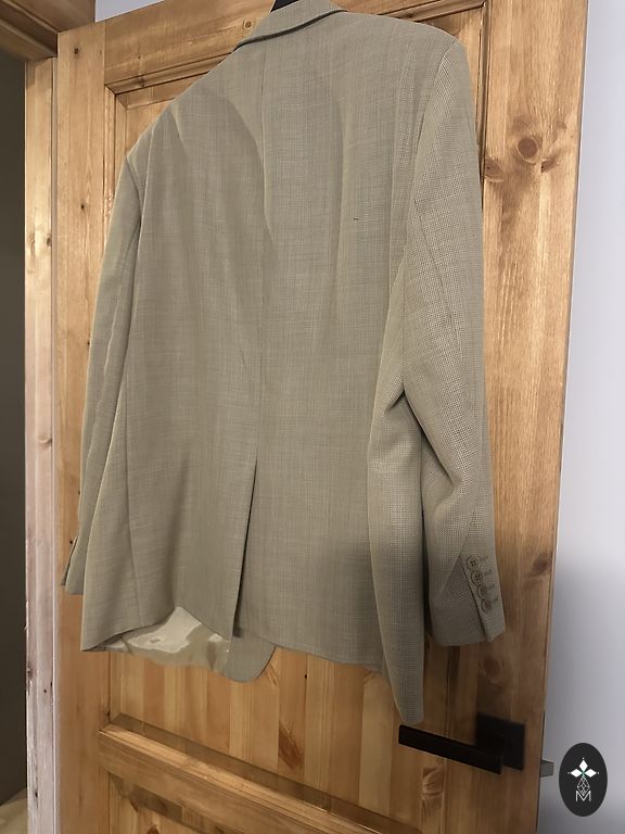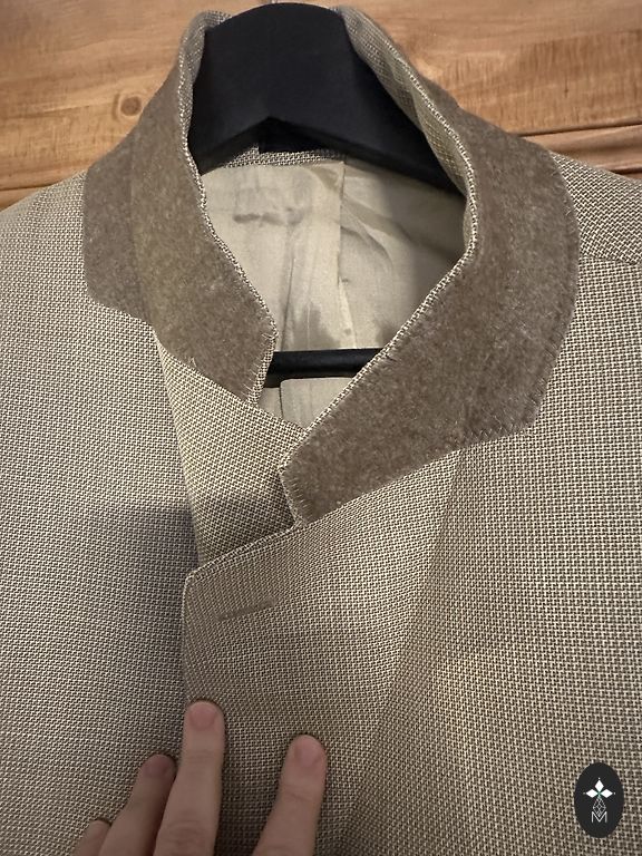 Mētelis labā stāvoklī, spiedpoogas būtu jāpiešuj atpakaļ kārtīgāk. Odere tīra, nesaplēsta, klasiska piegriezuma, aizmugurē šķēlums. Garums: 121 Rokas: 71 cm (neatlocītas), var nēsāt atlocītas