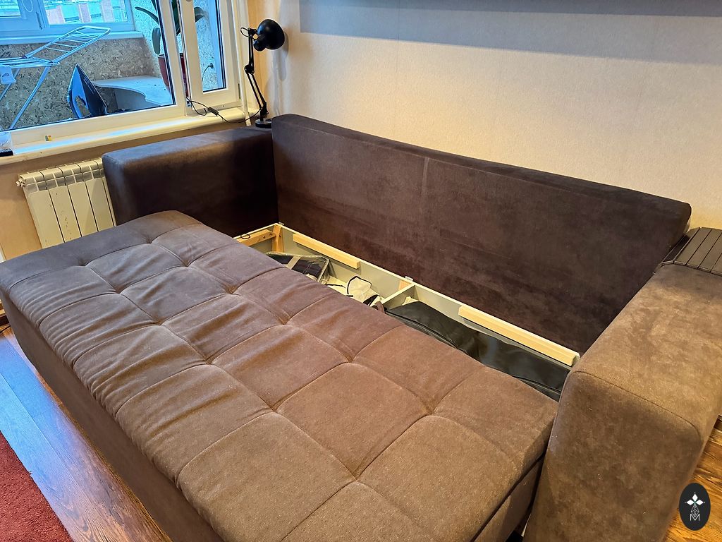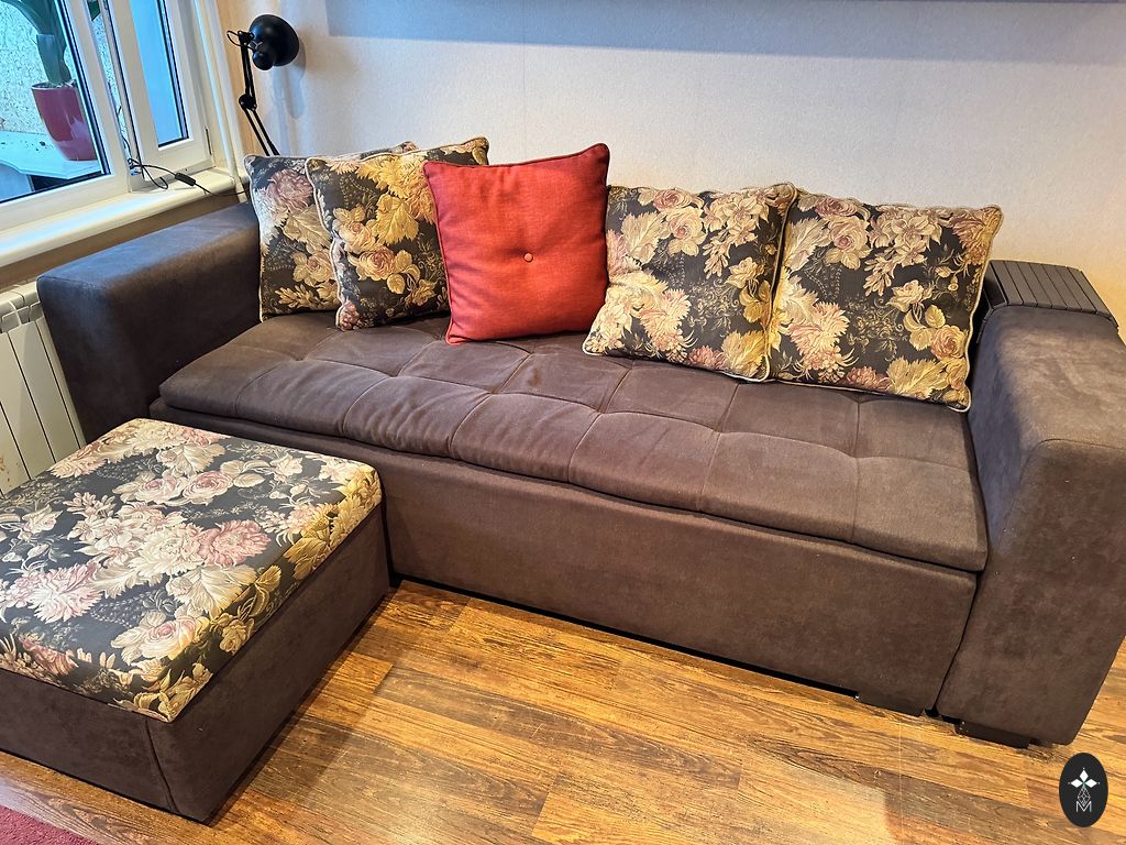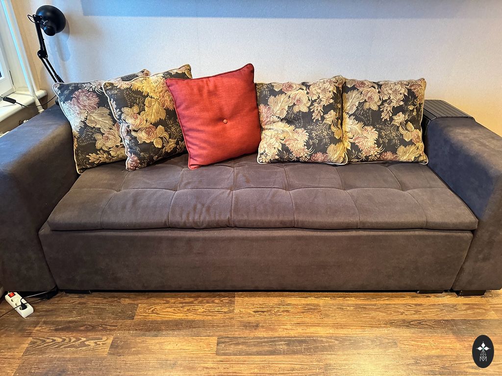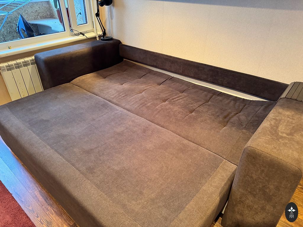 Didelis ištraukiamas sofa, su dėže po čiužiniu, kur galima laikyti daiktus. (Sofa visiškai išsitraukia). Reikia išvalyti, kai kur yra keletas dėmių. Paskutinėje nuotraukoje matoma duobutė, kurią galima pataisyti. Mes sofą buvome uždengę užvalkalu, todėl šios duobės nematyti. Savarankiškas išsivežimas iš Salaspilio.
