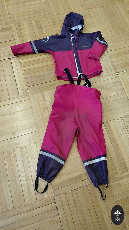 Labā stāvoklī, defekti redzami foto, uz rozā daļas neliels traips un nedaudz pairusi vīle. Iekšā ierakstīts bērna vārda. 104.izmērs. lietus jaka bez oderes.