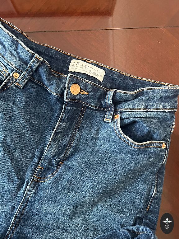 Темно-синий, размер M, косые карманы, которые подчеркивают фигуру.