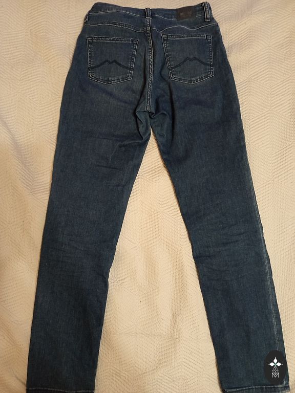 Tumsi zilas džinsas ar platiem galiem. Uzvilktas 2 reizes