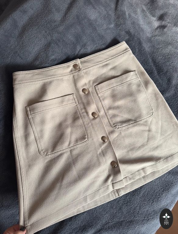 Materials like eco suede. Silver beige, has pockets. Suitable for size S-M. Length 44, Waist 70, Hips free.