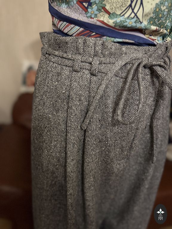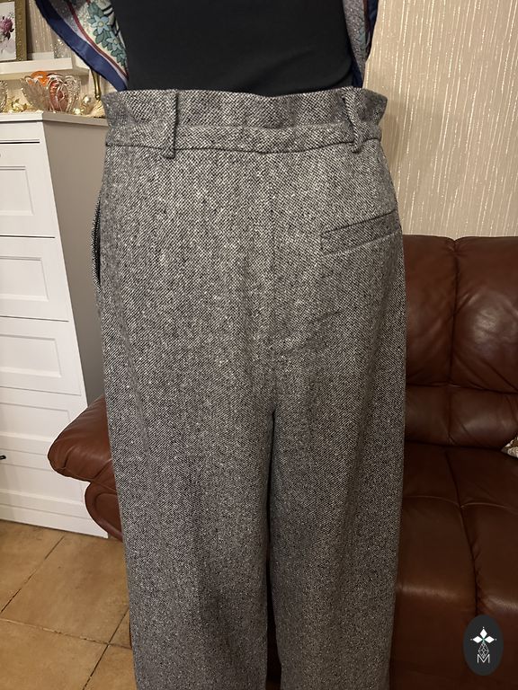 Culottes tipo kelnės, sutrumpintos, pilkos su juodomis, rudomis smulkiomis langelėmis, yra atvartai.