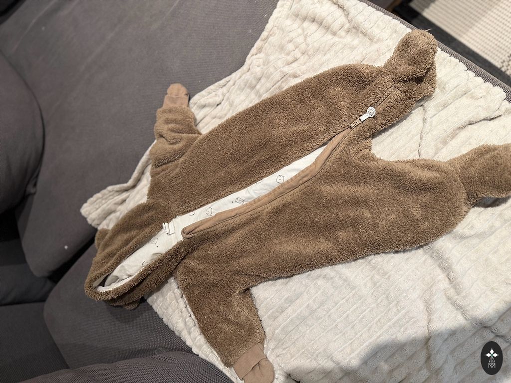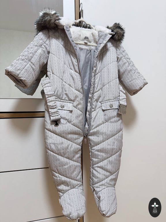 Kahe lukuga ülaosas, pakkudes mugavamat lapse riietamist. Üks lukk jalgade vahel, pakkudes lihtsamat mähkmete vahetust. Trukkidega kinnitatavad saapad. Paelaga ühendatud kindad. Materjal: Vooder: 30% vill, 70% polüester Välismaterjal: 100% polüester