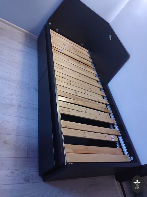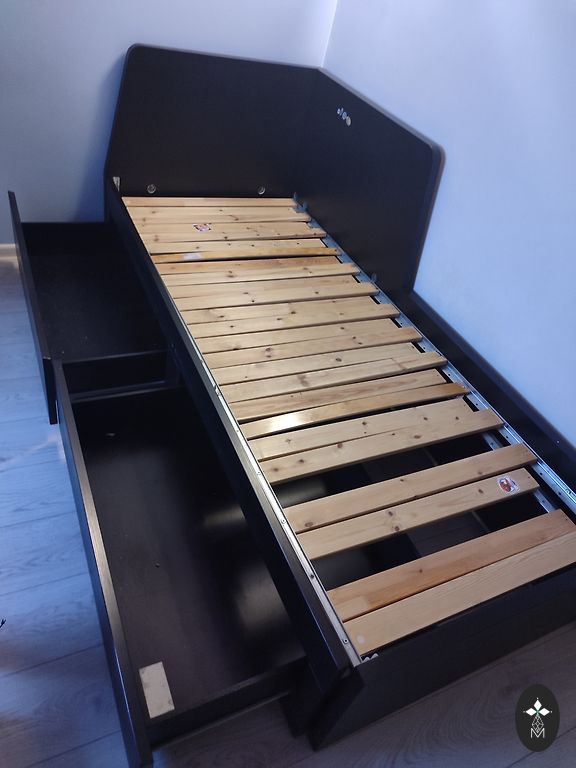 Atsperu matracis uz rāmja ar kājām. Izmērs 200x120 cm. Ir pārtapsēts audums. Sienas paneļi nav komplektā. Pārdodu , jo ir nepieciešama platāka gulta. Pašizvešana. Atrodas 3 stāvā. Centrs , Baznīcas iela.