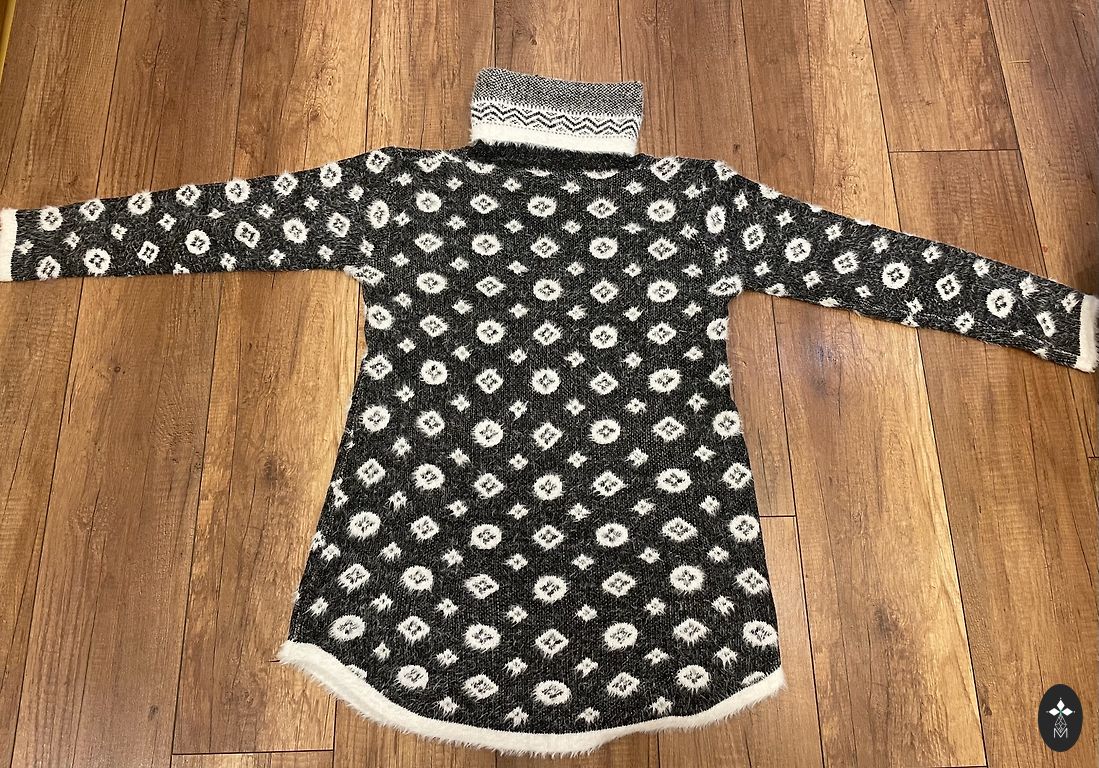 Bieza, izteikti silta. Pagarinātas rokas plaukstu sasildīšanai, aizmugurē neliels šķēlums. Krūtis 108-116cm, viduklis 104-112cm, gurni 106-112cm, rokas garums 67cm, kleitas garums 122cm