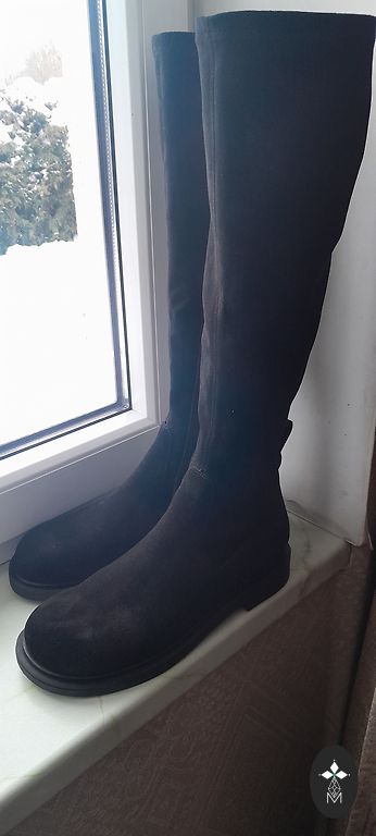 Nauji juodi odiniai batai su šiltu vilna viduje. Pagaminti Kambodžoje. Užsegimas su užtrauktuku. Išorinėje pusėje plotis gali būti reguliuojamas dirželiu ir sagtimi. Stora padas 1,8 cm. Kulnas 4,2 cm. Vidpadis 26,5 cm. Gerai tiks platesnei kojai su aukštu pakilimu. Bato ilgis 22 cm.