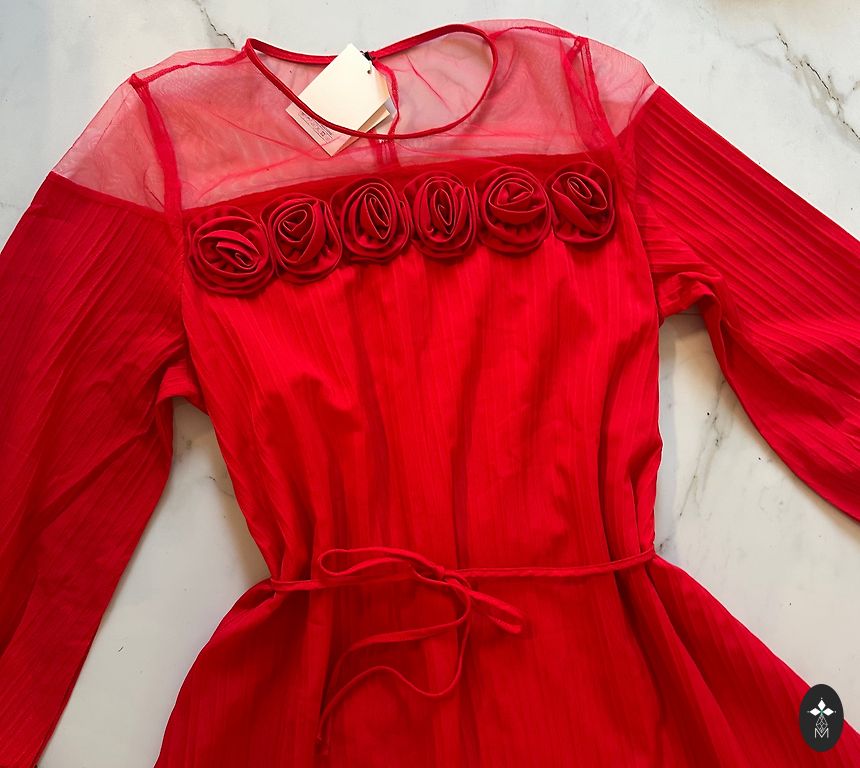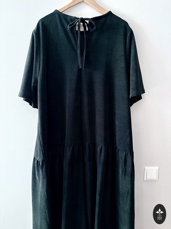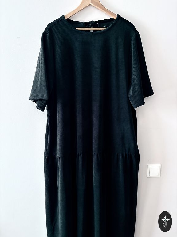 Liela un gara kokvilnas trikotāžas samta rītakleita maigs tonis. Garās piedurknes, kabata, josta. Ar jostu regulējams tērpa platums. Nosedz arī kājas.
