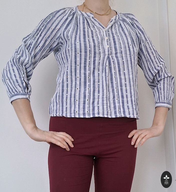 Palaidinė tampri. Gražus raukinys palei sagas ir apykaklę. Palaidinė prigludusi prie kūno.