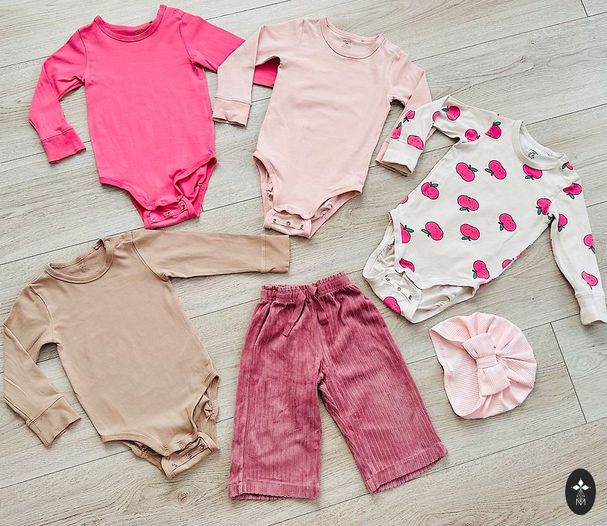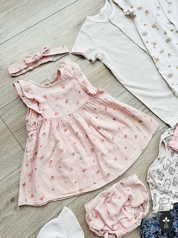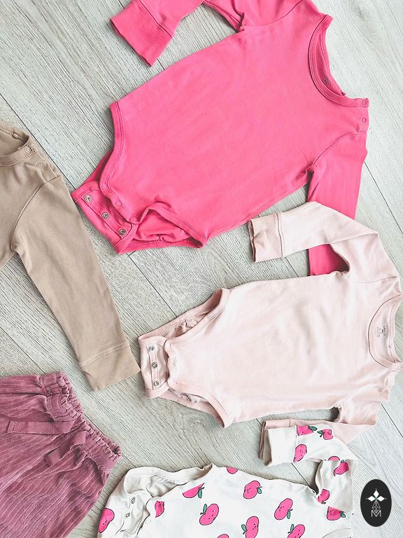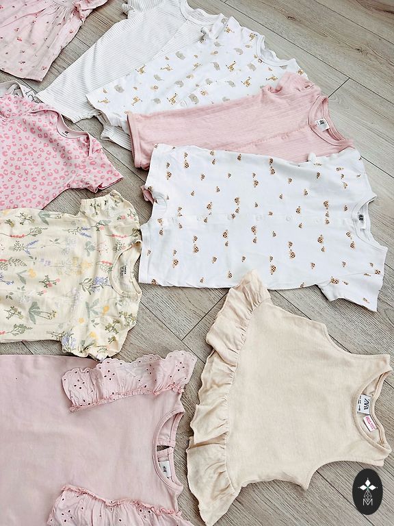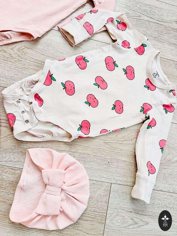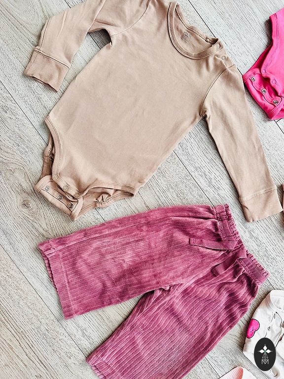 The two outer bodysuits with short sleeves are labeled 92, but will fit 74/80. Gifts with purchase.