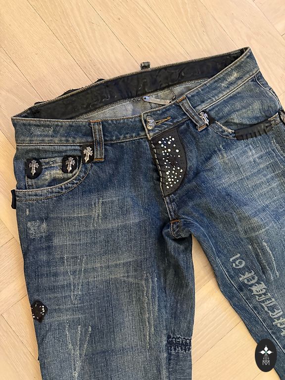 Sirge lõikega rebitud püksid laiemate otstega ja kõrge vöökohaga. Ühel põlvel on kandmisest jäänud veidi suurem rebend. Laius 34cm, pikkus 105cm, sisetükk 80cm.
