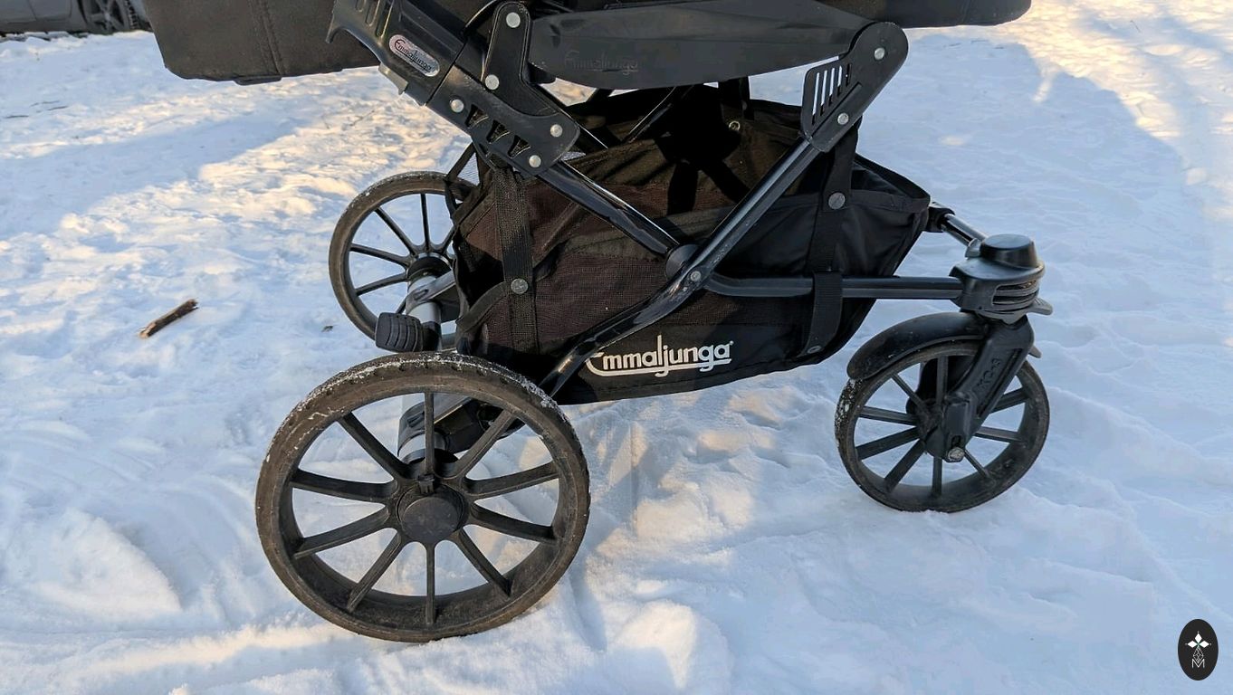 Excellent for navigating snow, forest trails, and sand, thanks to the large inflatable wheels and good suspension. The stroller is in full working order.