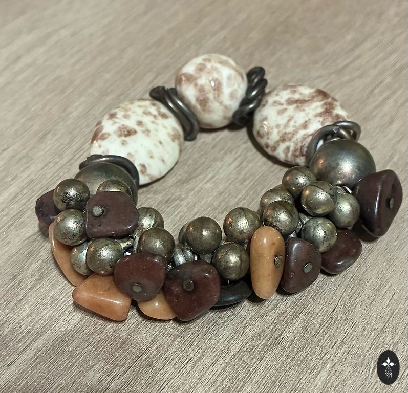 Originaalne käevõru mehaanilise kinnitusega (vedru). Ees on paigaldatud rohekas klaas. Sobib käe ümbermõõdule kuni 21 cm. Väga heas seisukorras.