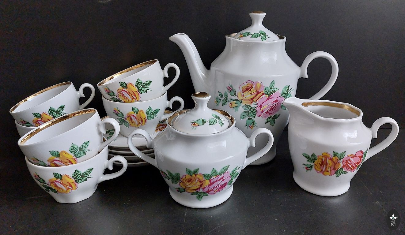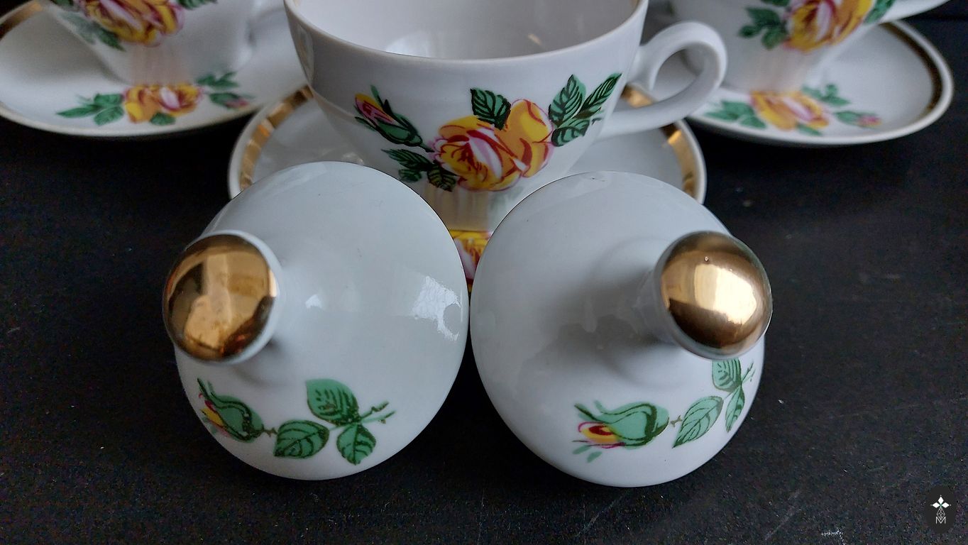 Apskritai gera būklė. Nedideli aukso nuostoliai ant dangtelio rankenos ir indo kraštelio. Mikro nuskilimas, kuris nufotografuotas labai arti. Naudojimui nėra blogai.