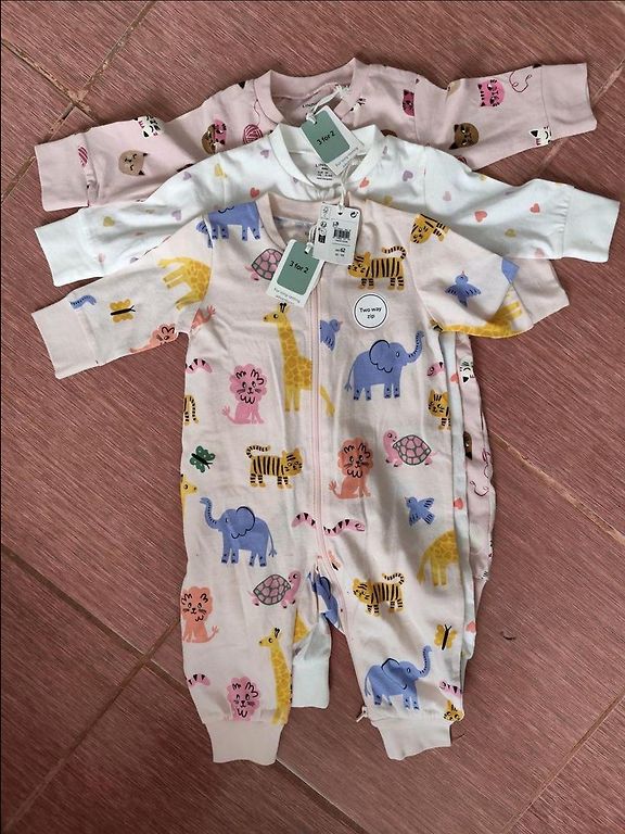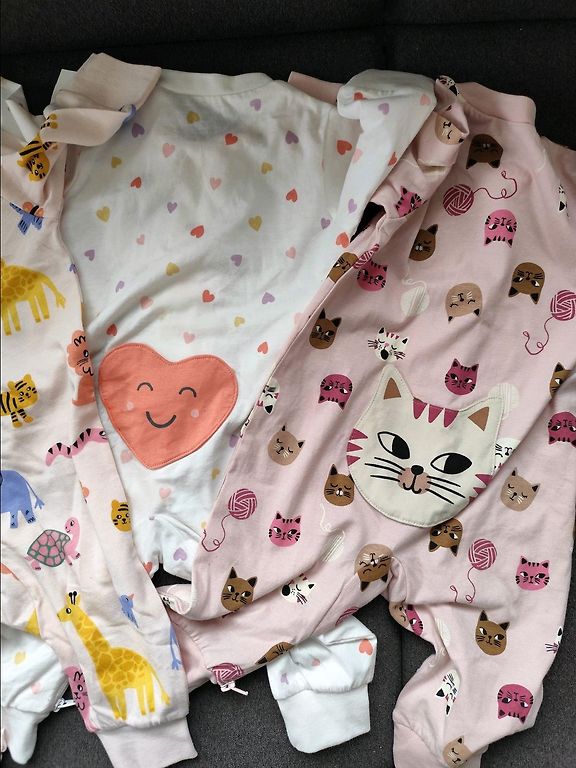 4 pcs of size 62 H&M pajamas. Button closure, with footies. There might be a stain, I didn't notice, worn by one child. The striped one is pilled in some places. We really liked them. +shipping