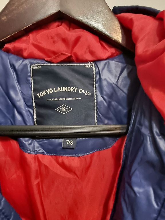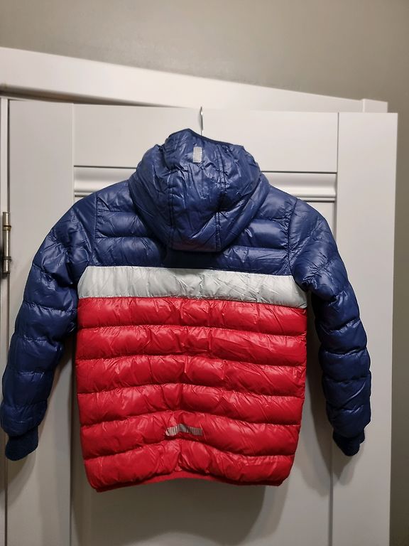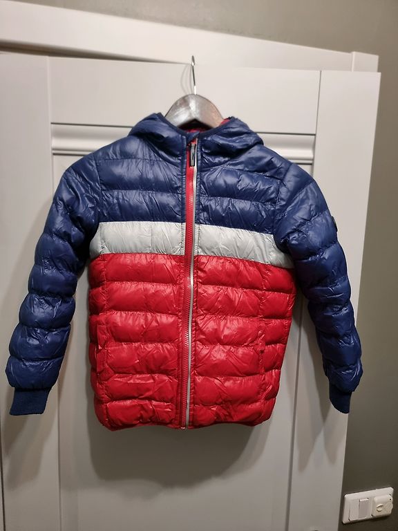 122[6-7m], žieminė striukė. Pati striukė labai geros būklės, nėra susivėlusi nuo skalbimo. Tačiau vienintelė problema yra ta, kad pjaunant etiketę, įpjauta pamušalas 1.5 cm. Visa kita labai geros būklės. Gyvenime spalva yra gražesnė.